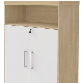 Possui três prateleiras internas e um nicho aberto para armazenar documentos, utensílios de sua preferência.