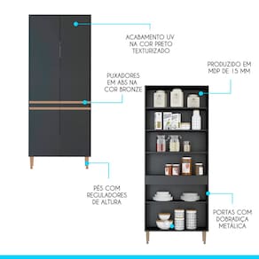 O Armário Paneleiro Vertical para Cozinha Sabrina foi desenvolvido para atender todas as suas necessidades do dia a dia com um design moderno, cheio de personalidade, funcionalidade e versatilidade. A cozinha preta é uma tendência e foi arquitetada para facilitar a sua rotina diária mantendo seu ambiente organizado e aconchegante. Possui quatro portas com prateleiras interna. A elegância fica por conta dos puxadores em perfil e os pés na cor bronze dando um toque único de sofisticação. Produzido com materiais de excelente qualidade, garantindo a durabilidade e vida útil. O melhor em móveis no design atual aliando conforto, qualidade e ótimos preços, só na Menu Móveis! Características: Produzido em MDP de 15 mm Acabamento UV na cor Preto Texturizado Portas com Dobradiças Metálicas Puxadores Perfil em ABS na cor Bronze Pés Reguláveis em ABS na cor Bronze Prateleiras suportam 5 Kg Dimensões: Altura: 202 Cm Largura: 80 Cm Profundidade: 31,5 Cm Peso: 42 Kg Garantia de 3 Meses\nATENÇÃO: Não trabalhamos e não nos responsabilizamos pela montagem do móvel. Antes da montagem conferir se o produto está de acordo com o que comprou, produto montado e danificado pela montagem não será aceito troca. Montagem e instalação por conta do comprador. As imagens ambientadas são meramente ilustrativas e podem apresentar itens que não compõe o produto. As cores do produto podem variar de acordo com o monitor, a iluminação do ambiente ou sua percepção visual. Limpeza: Deve ser feita com pano macio e seco ou levemente umedecido com água e sabão neutro. Não devem ser utilizados abrasivos como palha de aço e objetos cortantes. Ean: 7805295010283 Ean: 7805295010283