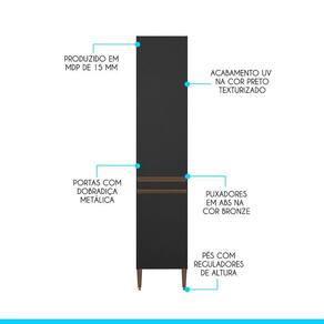 Armário Paneleiro P Cozinha Com 2 Portas Sabrina Menu Móveis Preto O Paneleiro de Cozinha Sabrina foi desenvolvido para atender todas as suas necessidades diarias com um design moderno, cheio de personalidade, beleza e versatilidade. Por se tratar de armario de cozinha modulado voce pode ajustar os modulos conforme o espaco disponivel e montar diversas modulacoes diferentes para deixar o ambiente muito mais aconchegante. A elegancia fica por conta dos puxadores em perfil e os pes na cor bronze dando um toque unico de sofisticacao. Produzido com materiais de excelente qualidade, garantindo a durabilidade e vida util. O melhor em moveis no design atual aliando conforto, qualidade e otimos precos, so na Menu Moveis! Caractristicas: Produzido em MDP de 15 mm Acabamento UV Texturizado Portas com Dobradicas Metalicas Puxadores Perfil em ABS Pes Regulaveis em ABS Prateleiras suportam 5 Kg