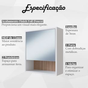 Armário Para Banheiro 1 Porta Com Espelho B85, contando com um design prático e funcional, este móvel é ideal para deixar seu banheiro mais elegante e moderno. Estrutura produzida em MDP de 15mm, contando com acabamento FF (Fosco), que proporciona maior durabilidade e resistência a peça. Composto por 1 Porta com Espelho de 3mm e dobradiças metálicas, 2 prateleiras com amplo espaço e 1 Nicho, ideal para armazenar itens. Suportando 5kg cada prateleira e 5kg o nicho. Este produto deverá ser fixado na parede. Perfeito para adicionar uma ambientação sofisticada ao seu banheiro. Este móvel chegará na sua casa em 1 volume.