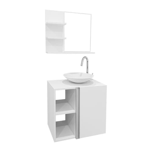 Tamanhos: Gabinete: Altura 50cm x Largura 55cm x Profundidade 35cm Cuba: 33,5cm de diâmetro e 8cm de altura Espelheira: Altura 45cm x Largura 55cm x Profundidade 13cm