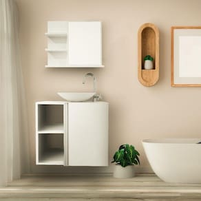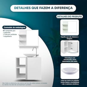 Obs: todos os objetos decorativos das fotos não estão inclusos (por exemplo: torneira, válvula universal para lavatório, sifão, itens de higiene pessoal, etc).
