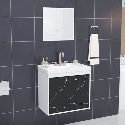 Gabinete suspenso em MDF e cuba em BMC branca, resistentes e duráveis. Estilo moderno, ideal para banheiros compactos.
