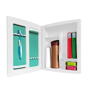 Com divisórias para facilitar o armazenamento de escovas de dentes e objetos de higiene.