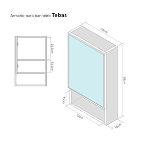 * Informações Técnicas: - Medidas Totais: 34cm de largura x 58cm de altura x 10cm de profundidade. - Compartimento Interno 1: 31cm de largura x 25,5cm de altura x 10cm de profundidade. - Compartimento Interno 2: 31cm de largura x 13,5cm de altura x 10cm de profundidade. - Nicho externo: 31cm de largura x 13cm de altura x 10cm de profundidade. - O espelho mede: 33cm de largura x 42,5cm de altura. - Peso do armário: 5,5kg.