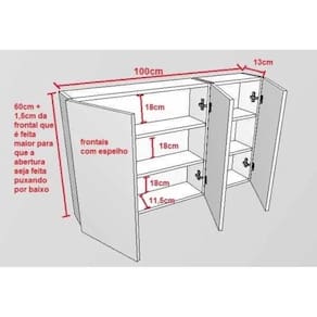 Espelheira armário para banheiro em MDF com espelhoO produto vai enviado desmontado e com instruções de montagemMedidas externas do produto: L 100cm x A 60cm x P13cmA frontal tem 61,5 para que a abertura da porta seja feita puxando por baixo, não utilizando puxador para dar a impressão de ser um armário oculto.Dobradiças com amortecimento para evitar o fechamento brusco das portas Fabricada em MDF com revestimento BP, resistente a umidade, resistente a riscos.