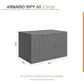 Produto fabricado em MDP PF (15mm), com ripas autênticas fabricadas em HDF BP (06mm), na largura de 20mm. Puxadores de alumínio anodizado, gavetas com corrediças telescópicas e porta com dobradiças slow (35 mm), com sistema amortecedor, que proporcionam fechamento suave da mesma. Acompanha parafusos buchas para fixação na parede. Possui manual de instalação. Armário ideal para compor com as Bancadas Ripy da marca BLU LAVATÓRIOS (vide site do Madeira Madeira). Produto sai montado de fábrica, devidamente regulado, bastando apenas fixá-lo na parede. Garantia de 12 meses para defeito de fabricação. Acabamento da Gaveta: BP Acabamento da Porta: BP Ambiente Principal: Banheiro Cor: Cinza Cor do Produto: Cinza Cor Interna: Cinza Escala de Brilho: Acetinado Escala de Brilho da Gaveta: Semi-Fosco Escala de Brilho da Porta: Semi-Fosco Gaveta com Chave: Não Informações Complementares: Produto sai montado de fábrica, devidamente regulado, bastando apenas fixá-lo na parede. Itens Inclusos: 01 Armário Suspenso 60cm Linha ou Coleção: Ripy Manual de Montagem e Instalação: https://product-hub-prd.madeiramadeira.com.br/896385/documents/8599864a-3c16-4f80-9a26-3fec200a701a1931119armarioripy60.pdf Material da Gaveta: MDF/MDP Material da Porta: MDF/MDP Material do Puxador da Gaveta: Alumínio Material do Puxador da Porta: Alumínio Material Principal: MDF/MDP Necessita Montagem: Não Origem do Produto: Nacional Peso: 16,5 kg Peso Máximo por Gaveta: 4 Possui Espelho: Não Possui Pés: Não Possui Portas: 01 Possui Prateleiras: Não Recomendações de Uso, Manutenção e Limpeza: Nunca utilizar produtos químicos. Use somente flanela levemente umedecida em água e em seguida uma outra seca e macia. Caso ocorra vazamento ou acúmulo de água no produto, enxugar imediatamente. Suporta Até (kg): 8 Tipo de Corrediça da Gaveta: Metálica Telescópica Tipo de Dobradiça/Corrediça da Porta: Metálica Tipo de Porta: Bater Tipo de Puxador da Gaveta: Externo Tipo de Puxador da Porta: Externo