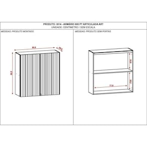 O ARMÁRIO 800 PT ARTICULADA ART é fabricado com materiais de alta qualidade, garantindo durabilidade e resistência ao longo do tempo. Cada componente é cuidadosamente selecionado para oferecer o melhor em termos de construção e acabamento. Possuindo a precisão das dobradiças com amortecedor melhorando assim a praticidade e funcionalidade no dia a dia, evitando os impactos. Com portas passantes que vão facilitar a abertura, oferecem à cozinha um estilo contemporâneo e descomplicado. Possui um sistema de portas articuladas que redefine o conceito de praticidade e elegância nas cozinhas compactas. Acabamento da Prateleira: Pintura Texturizada UV Escala de Brilho da Prateleira: Fosco Acabamento da Porta: Pintura Texturizada UV Escala de Brilho da Porta: Fosco Material do Puxador da Porta: Alumínio Acompanha Tampo: Não Ambiente Principal: Cozinha Complexidade da Montagem: Média: pode ser montado por mais de uma pessoa e/ou necessite de maior conhecimento para montagem Cor: Freijó Soft Cor do Produto: Freijó Soft Cor Interna: Freijó Escala de Brilho: Fosco Espessura do Material da Estrutura: 12 mm Informações Complementares: Considerar um peso bem distribuído por todo o produto. Itens Inclusos: 1 ARMÁRIO 800 PT ARTICULADA ART + MANUAL DE MONTAGEM Linha ou Coleção: Cozinhas Compactas Manual de Montagem e Instalação: https://product-hub-prd.madeiramadeira.com.br/896557/documents/45ee2187-0673-47ee-bf8f-9c8199d6cfc74armArio800ptarticuladaart.pdf Material da Dobradiça/Corrediça da Porta: Metálica Material da Porta: MDP Material da Prateleira: MDP modular: Não Necessita Montagem: Sim O Balcão Acompanha Pia: Não Origem do Produto: Nacional Peso: 16,75 kg Peso Máximo por Prateleira: 8 kg Possui Espelho: Não Possui Possui Pés: Não Possui Portas: Sim Possui Prateleiras: Sim Possui Vidro: Não Recomendações de Uso, Manutenção e Limpeza: Limpeza do produto somente com pano seco ou levemente umedecido, não utilizar abrasivos. Respeitar o limite de peso estabelecido no esquema de montagem. Evitar mover o produto com utensílios dentro. Sapatas Niveladoras: Não Sistema de Montagem: Pregos, parafusos e cavilha Suporta Até (kg): 16 kg Tamanho Indicado da Pia: NÃO POSSUI BALCÃO Tamanho Indicado do Tampo: NÃO POSSUI BALCÃO Tipo de Dobradiça/Corrediça da Porta: 35 mm Tipo de Puxador da Porta: Externo
