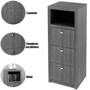 Característica do Armário para Escritório com 3 Gavetas Arquivo: - Estrutura em MDP; - Acabamento em BP; - Gaveteiro arquivo pasta suspensa; - 3 gavetas; - 1 nicho; - Puxadores em plástico; - Suporta até 5kg prateleira e 11kg cada gaveta; - Não acompanha objetos de decoração;