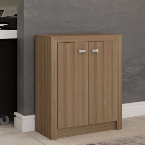 O(a) Armário para Escritório Eva 2 Portas Baixo Amêndoa - Loja é produzido em MDP na escala de brilho Brilho e Fosco, e possui um grau de dificuldade de montagem: Médio.