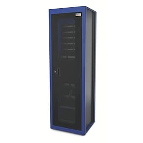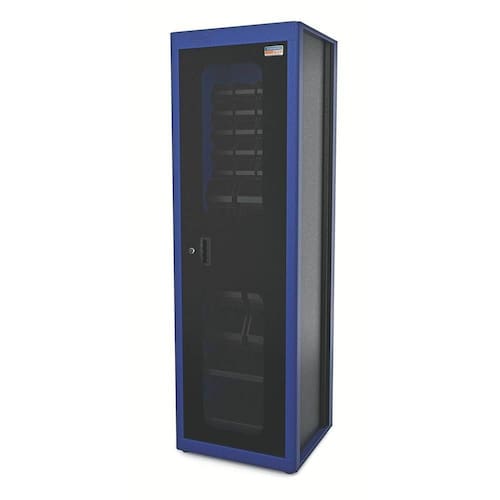 Estrutura em chapas de aço conformadas. Porta com abertura de 100 com visores de acrílico. Tranca para as portas. Pintura eletrostática. Capacidade de carga máxima distribuída: 200 kg. Capacidade de carga distribuída de cada prateleira: 60 kg. Espessuras das chapas do corpo, porta e prateleiras: 0,9 mm.Utilizado para armazenamento de ferramentas. Possui 2 prateleiras móveis que possibilitam diferentes configurações de montagem. Acompanha 29 caixas plásticas BIN sendo 16 caixas n 3, 9 caixas n 5 e 4 caixas n 7 para o armazenamento de peças pequenas, tais como parafusos, porcas, arruelas, etc. Com 4 pés para regulagem de altura, para compensar irregularidades no piso. Porta com visores de acrílico que possibilita visualizar a parte interna. Abertura da porta para a direita. Capacidade de carga e resistência da estrutura comprovadas através de testes práticos.