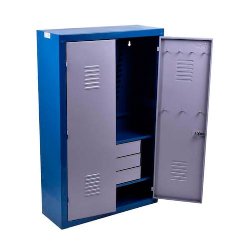 - Características Contém duas prateleiras Contém acessórios para ferramentas e 3 gavetas Pintura Eletrostática Possui porta com sistema anti-furto Ármario chaveado Acompanha chave reserva Possui furação com reforço para fixação na parede Não acompanha bucha e parafuso para fixação Divisórias nas Gavetas 01 e 02