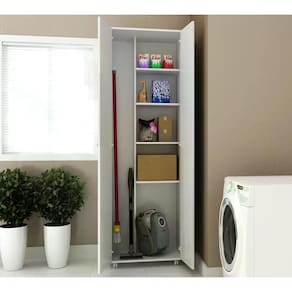 Armário Multi, é o móvel que faltava para deixar sua área de serviço mais organizada e funcional, com estrutura em MDP de 15mm, pintura com acabamento em Uv (Brilho). Possui 02 portas com dobradiças metálicas, puxadores em PVC cromados, 04 prateleiras internas que suportam até 4 kg cada, espaço lateral conta com cabideiro de 3 ganchos para pendurar vassoura, rodo ou panos de limpeza, irá tornar suas tarefas diárias muto mais práticas, acompanha 04 rodízios deslizantes. Este móvel chegará em sua casa separado em 01 volume.
