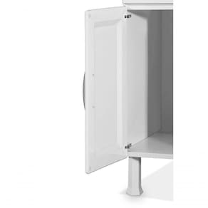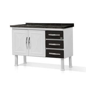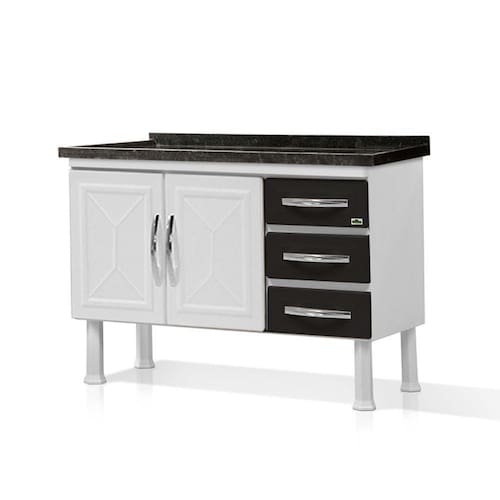 O gabinete de aço Marroart modelo Ellos tem toda a sua estrutura de aço carbono e acabamento em pintura eletrostática, o que confere durabilidade e resistência ao produto. Com duas portas e três gavetas é um excelente item para organizar os objetos. As portas possuem design exclusivo e são almofadadas, isto é, são duas chapas de aço que proporcionam um ótimo acabamento, proteção contra insetos, maior resistência. As dobradiças são de pressão para um manuseio suave. As gavetas usam corrediça tipo roldana; possui fundo e passagem para o sifão. Puxadores cromados e pés em polipropileno..