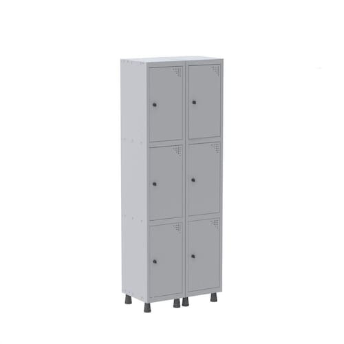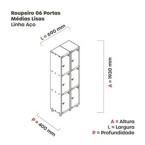 Armário Roupeiro de Aço totalmente montável, dispensa a utilização de parafusos, estrutura em chapas #24 e #26 (0,60mm e 0,45mm) conta com uma porta com estampos circulares em formação triangular para ventilação, sistema de fechamento de varão de 3 pontos, através de pitão para cadeado. Acabamento da Porta: Pintura Ambiente Principal: Banheiro Complexidade da Montagem: Média: pode ser montado por mais de uma pessoa e/ou necessite de maior conhecimento para montagem Cor: Cinza Cor do Produto: Cinza Cor Interna: Cinza Escala de Brilho: Semi-Fosco Escala de Brilho da Porta: Semi-Fosco Itens Inclusos: 1 Armário, Kit Ferragens e Manual de Montagem Manual de Montagem e Instalação: https://cdn2.madeiramadeira.com.br/prd/pandin/689554-view-usp-sharing.view%3Fusp%3Dsharing Material da Porta: Aço Material dos Pés: Polipropileno Material Principal: Aço Necessita Montagem: Sim Origem do Produto: Nacional Pés Reguláveis: Sim Peso: 28.99 Possui Espelho: Não Possui Pés: 08 Possui Portas: 06 Possui Prateleiras: Não Recomendações de Uso, Manutenção e Limpeza: Utilizar um pano levemente umedecido com água, para finalizar utilizar um pano seco. Sapatas Niveladoras: Não Sistema de Montagem: Encaixe Suporta Até (kg): 15 Tipo de Dobradiça/Corrediça da Porta: Aço Tipo de Puxador da Porta: Embutido