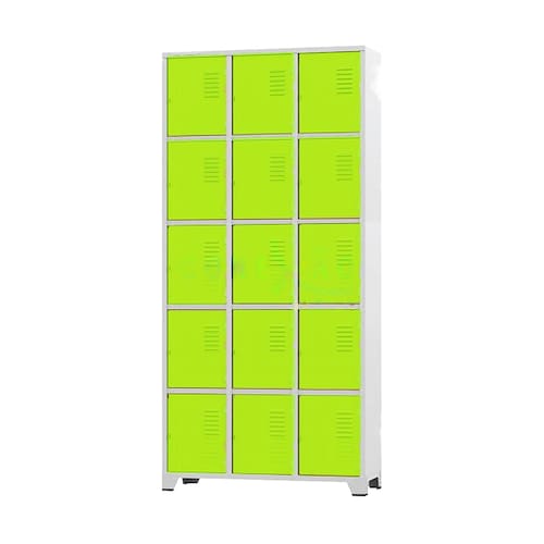 CONEXÃO MOVEISArmário Roupeiro de aço para vestiário,ideal para academias, surpermercados, empresa e para uso geral. Produzido em aço chapa 26 0,45mm de alta qualidade com tratamento anti-ferruginoso, o acabamento em sistema de pintura eletrostática a alta temperatura epóxi, tambem garante maior durabilidade da cor e resistencia a ferrugem. Possui 15 portas com venezianas para ventilação, compartimentos de tamanhos médios independentes sem divisórias internas, que garante que você consiga armazenar itens como bolsas, mochilas e entre outros. O fechamento das portas é através de CHAVE. Características- Quantidade de Portas: 15- Cor: Cinza Padrão / Portas Verdes- Chapa: 26 / 0,45mm- Medida das Portas/ Vãos: 035Alt x 026Larg- Sistema de Ventilação: Veneziana- Fechamento: CHAVE- Quantidade de cabides por porta: 0- Pés removíveis: Não- Desmontável: Não ( Exceto portas que podem ser trocadas ).- Pintura: Epóxi PóALTURA: 197cmLARGURA: 92cmPROFUNDIDADE: 36cmPESO: 35kgGARANTIA: 3 MesesEspecificação de chapa e acabamento: Roupeiro produzido em chapa de aço tratada com antiferruginoso por fosfatização e pintura epóxi-pó por processo eletrostático.