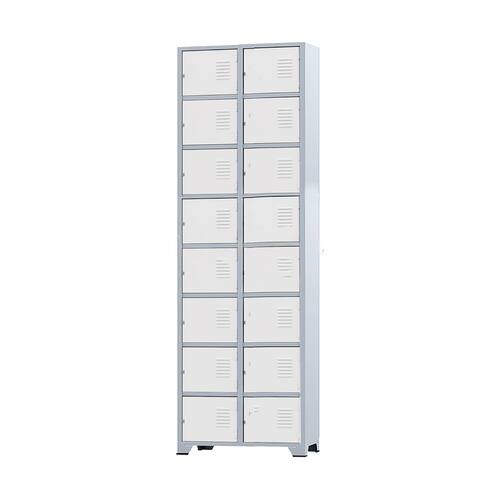 CONEXÃO OFFICEArmário Roupeiro de aço para vestiário,ideal para academias, surpermercados, empresa e para uso geral. Produzido em aço chapa 26 0,45mm de alta qualidade com tratamento anti-ferruginoso, o acabamento em sistema de pintura eletrostática a alta temperatura epóxi, tambem garante maior durabilidade da cor e resistencia a ferrugem. Possui 16 portas com venezianas para ventilação, compartimentos de tamanhos médios independentes sem divisórias internas, que garante que você consiga armazenar itens como bolsas, mochilas e entre outros. O fechamento das portas é através de CHAVE. Características- Quantidade de Portas: 16- Cor: Cinza Padrão / Portas Brancas- Chapa: 26 / 0,45mm- Medida das Portas/ Vãos: 021Alt x 026Larg- Sistema de Ventilação: Veneziana- Fechamento: CHAVE- Quantidade de cabides por porta: 0- Pés removíveis: Não- Desmontável: Não ( Exceto portas que podem ser trocadas ).- Pintura: Epóxi PóALTURA: 197cmLARGURA: 63cmPROFUNDIDADE: 36cmPESO: 35kgGARANTIA: 3 MesesEspecificação de chapa e acabamento: Roupeiro produzido em chapa de aço tratada com antiferruginoso por fosfatização e pintura epóxi-pó por processo eletrostático.