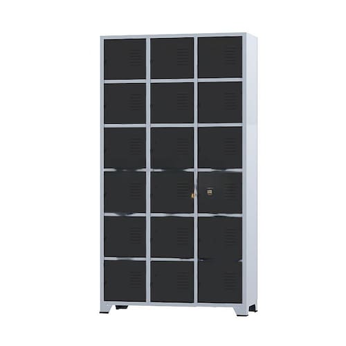 Armário Roupeiro de aço para vestiário,ideal para academias, surpermercados, empresa e para uso geral. Produzido em aço chapa 26 0,45mm de alta qualidade com tratamento anti-ferruginoso, o acabamento em sistema de pintura eletrostática a alta temperatura epóxi, tambem garante maior durabilidade da cor e resistencia a ferrugem. Possui 18 portas com venezianas para ventilação, compartimentos de tamanhos médios independentes sem divisórias internas, que garante que você consiga armazenar itens como bolsas, mochilas e entre outros. O fechamento das portas é através de pitão para cadeado.
