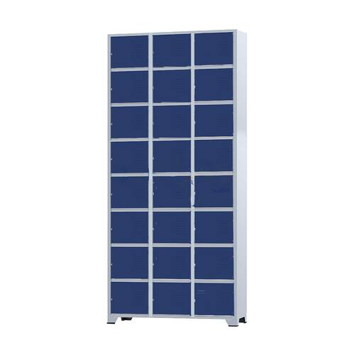 CONEXÃO OFFICEArmário Roupeiro de aço para vestiário, produzido em aço chapa 26 0,45mm, possui 24 portas com venezianas para ventilação, compartimentos de tamanhos médios independentes sem divisórias internas, fechamento das portas através de CHAVE.Características- Quantidade de Portas: 24- Cor: Cinza Padrão / Portas Azul Marinho- Chapa: 26 / 0,45mm- Medida das Portas/ Vãos: 021Alt x 026Larg- Sistema de Ventilação: Veneziana- Fechamento: CHAVE- Quantidade de cabides por porta: 0- Pés removíveis: Não- Desmontável: Não ( Exceto portas que podem ser trocadas ).- Pintura: Epóxi PóALTURA: 197cmLARGURA: 92cmPROFUNDIDADE: 36cmPESO: 35kgGARANTIA: 3 MesesEspecificação de chapa e acabamento: Roupeiro produzido em chapa de aço tratada com antiferruginoso por fosfatização e pintura epóxi-pó por processo eletrostático.