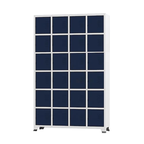 CONEXÃO OFFICEArmário Roupeiro de aço para vestiário,ideal para academias, surpermercados, empresa e para uso geral. Produzido em aço chapa 26 0,45mm de alta qualidade com tratamento anti-ferruginoso, o acabamento em sistema de pintura eletrostática a alta temperatura epóxi, tambem garante maior durabilidade da cor e resistencia a ferrugem. Possui 24 portas com venezianas para ventilação, compartimentos de tamanhos médios independentes sem divisórias internas, que garante que você consiga armazenar itens como bolsas, mochilas e entre outros. O fechamento das portas é através de CHAVE. Características- Quantidade de Portas: 24- Cor: Cinza Padrão / Portas Azul Marinho- Chapa: 26 / 0,45mm- Medida das Portas/ Vãos: 029Alt x 026Larg- Sistema de Ventilação: Veneziana- Fechamento: CHAVE- Quantidade de cabides por porta: 0- Pés removíveis: Não- Desmontável: Não ( Exceto portas que podem ser trocadas ).- Pintura: Epóxi PóALTURA: 197cmLARGURA: 122cmPROFUNDIDADE: 36cmPESO: 50kgGARANTIA: 3 MesesEspecificação de chapa e acabamento: Roupeiro produzido em chapa de aço tratada com antiferruginoso por fosfatização e pintura epóxi-pó por processo eletrostático.