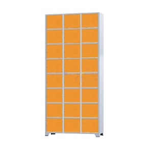 CONEXÃO OFFICEArmário Roupeiro de aço para vestiário,ideal para academias, surpermercados, empresa e para uso geral. Produzido em aço chapa 26 0,45mm de alta qualidade com tratamento anti-ferruginoso, o acabamento em sistema de pintura eletrostática a alta temperatura epóxi, tambem garante maior durabilidade da cor e resistencia a ferrugem. Possui 24 portas com venezianas para ventilação, compartimentos de tamanhos médios independentes sem divisórias internas, que garante que você consiga armazenar itens como bolsas, mochilas e entre outros. O fechamento das portas é através de chave. Características- Quantidade de Portas: 24- Cor: Cinza Padrão / Portas Laranjas- Chapa: 26 / 0,45mm- Medida das Portas/ Vãos: 021Alt x 026Larg- Sistema de Ventilação: Veneziana- Fechamento: chave- Quantidade de cabides por porta: 0- Pés removíveis: Não- Desmontável: Não ( Exceto portas que podem ser trocadas ).- Pintura: Epóxi PóALTURA: 197cmLARGURA: 92cmPROFUNDIDADE: 36cmPESO: 35kgGARANTIA: 3 MesesEspecificação de chapa e acabamento: Roupeiro produzido em chapa de aço tratada com antiferruginoso por fosfatização e pintura epóxi-pó por processo eletrostático.