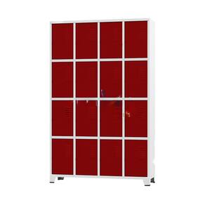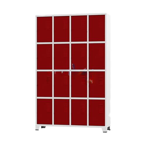 CONEXÃO OFFICEArmário Roupeiro de aço para vestiário,ideal para academias, surpermercados, empresa e para uso geral. Produzido em aço chapa 26 0,45mm de alta qualidade com tratamento anti-ferruginoso, o acabamento em sistema de pintura eletrostática a alta temperatura epóxi, tambem garante maior durabilidade da cor e resistencia a ferrugem. Possui 16 portas com venezianas para ventilação, compartimentos de tamanhos médios independentes sem divisórias internas, que garante que você consiga armazenar itens como bolsas, mochilas e entre outros. O fechamento das portas é através de CHAVE Características- Quantidade de Portas: 16- Cor: Corpo Cinza / Portas Vermelhas- Chapa: 26 / 0,45mm- Medida das Portas/ Vãos: 046Alt x 027Larg- Sistema de Ventilação: Veneziana- Fechamento: CHAVE- Quantidade de cabides por porta: 0- Pés removíveis: Não- Desmontável: Não ( Exceto portas que podem ser trocadas ).- Pintura: Epóxi Pó- Imagens meramente ilustrativas.- As cores podem apresentar variações de tonalidade.ALTURA: 197cmLARGURA: 122cmPROFUNDIDADE: 36cmPESO: 50kgEspecificação de chapa e acabamento: Roupeiro produzido em chapa de aço tratada com antiferruginoso por fosfatização e pintura epóxi-pó por processo eletrostático.