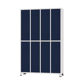 CONEXÃO OFFICEArmário Roupeiro de aço para vestiário,ideal para academias, surpermercados, empresa e para uso geral. Produzido em aço chapa 26 0,45mm de alta qualidade com tratamento anti-ferruginoso, o acabamento em sistema de pintura eletrostática a alta temperatura epóxi, tambem garante maior durabilidade da cor e resistencia a ferrugem. Possui 8 portas com venezianas para ventilação, compartimentos de tamanhos médios independentes sem divisórias internas, que garante que você consiga armazenar itens como bolsas, mochilas e entre outros. O fechamento das portas é através de CHAVE. Características:- Quantidade de Portas: 08- Corpo: Corpo Cinza / Porta Azul Marinho- Chapa: 26 / 0,45mm- Medida das Portas/ Vãos: 092Alt x 027Larg- Sistema de Ventilação: Veneziana- Fechamento: CHAVE- Quantidade de cabides por porta: 2- Pés removíveis: Não- Desmontável: Não ( Exceto portas que podem ser trocadas ).- Pintura: Epóxi Pó- Imagens meramente ilustrativas.- As cores podem apresentar variações de tonalidade.ALTURA: 198cmLARGURA: 122cmPROFUNDIDADE: 36cmPESO: 50kgEspecificação de chapa e acabamento: Roupeiro produzido em chapa de aço tratada com antiferruginoso por fosfatização e pintura epóxi-pó por processo eletrostático.