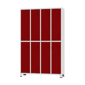 CONEXÃO OFFICEArmário Roupeiro de aço para vestiário,ideal para academias, surpermercados, empresa e para uso geral. Produzido em aço chapa 26 0,45mm de alta qualidade com tratamento anti-ferruginoso, o acabamento em sistema de pintura eletrostática a alta temperatura epóxi, tambem garante maior durabilidade da cor e resistencia a ferrugem. Possui 8 portas com venezianas para ventilação, compartimentos de tamanhos médios independentes sem divisórias internas, que garante que você consiga armazenar itens como bolsas, mochilas e entre outros. O fechamento das portas é através de CHAVE. Características:- Quantidade de Portas: 08- Corpo: Corpo Cinza / Portas Vermelhas- Chapa: 26 / 0,45mm- Medida das Portas/ Vãos: 092Alt x 027Larg- Sistema de Ventilação: Veneziana- Fechamento: CHAVE- Quantidade de cabides por porta: 2- Pés removíveis: Não- Desmontável: Não ( Exceto portas que podem ser trocadas ).- Pintura: Epóxi Pó- Imagens meramente ilustrativas.- As cores podem apresentar variações de tonalidade.ALTURA: 198cmLARGURA: 122cmPROFUNDIDADE: 36cmPESO: 50kgEspecificação de chapa e acabamento: Roupeiro produzido em chapa de aço tratada com antiferruginoso por fosfatização e pintura epóxi-pó por processo eletrostático.
