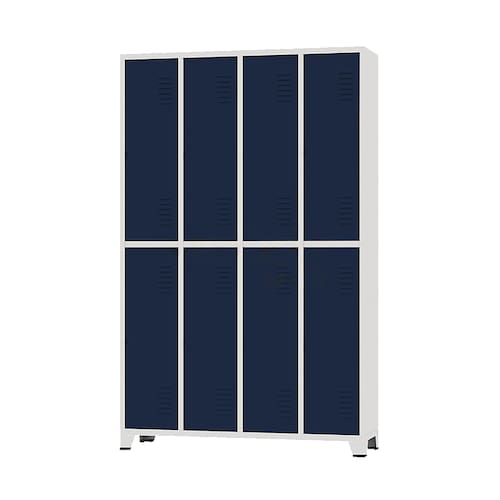 Armário Roupeiro de aço para vestiário,ideal para academias, surpermercados, empresa e para uso geral. Produzido em aço chapa 26 0,45mm de alta qualidade com tratamento anti-ferruginoso, o acabamento em sistema de pintura eletrostática a alta temperatura epóxi, tambem garante maior durabilidade da cor e resistencia a ferrugem. Possui 8 portas com venezianas para ventilação, compartimentos de tamanhos médios independentes com 1 prateleira, que garante que você consiga armazenar itens como bolsas, mochilas e entre outros. O fechamento das portas é através de pitão para cadeado.
