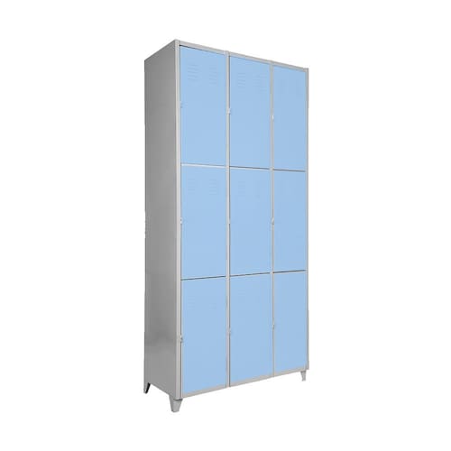 CONEXÃO OFFICE Armário Roupeiro de aço para vestiário, produzido em aço chapa 26 0,45mm, possui 3 portas com venezianas para ventilação, compartimento de tamanho grandes independentes sem divisórias internas, fechamento das portas através de CHAVE.Características- Quantidade de Portas: 9- Cor: Azul Claro- Chapa: 26 / 0,45mm- Medida das Portas/ Vãos: 092Alt x 027Larg- Sistema de Ventilação: Veneziana- Fechamento: CHAVE- Quantidade de cabides por porta: 2- Pés removíveis: Não- Desmontável: Não ( Exceto portas que podem ser trocadas ).- Pintura: Epóxi PóALTURA: 198cmLARGURA: 093cmPROFUNDIDADE: 37cmPESO: 30kgGARANTIA: 6 MesesEspecificação de chapa e acabamento: Roupeiro produzido em chapa de aço tratada com antiferruginoso por fosfatização e pintura epóxi-pó por processo eletrostático.