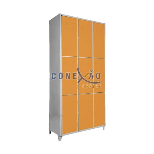 Armário Roupeiro de aço para vestiário, produzido em aço chapa 26 0,45mm, possui 3 portas com venezianas para ventilação, compartimento de tamanho grandes independentes sem divisórias internas, fechamento das portas através de pitão para cadeado.