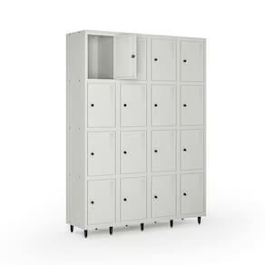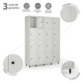 Fabricado em chapa de aço nº 26 (0,045cm), o roupeiro conta com 16 portas individuais, tratamento anticorrosão e pintura eletrostática a pó.