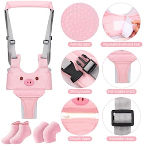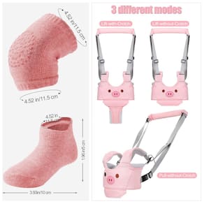 Características: O arnês de caminhada infantil pode ser aplicado na maioria das situações, o bebê não sentirá calor e irritação mesmo no verão. Com este arnês de caminhada para bebê, você pode evitar a dor dolorida nas costas causada pela inclinação e flexão enquanto segura a mão do bebê. Leve e de secagem rápida, confortável e respirável, macio e amigável para a pele, um ajudante ideal para crianças e pais. Especificações: Cor: como mostrado Tamanho: conforme mostrado Material: tecido de algodão macio, nylon A embalagem inclui: 1 arnês de caminhada para bebês. 8 meias antiderrapantes para crianças pequenas (4 pares). 8 joelhos antiderrapantes para bebês engatinhando (4 pares). Observações de aquecimento: Certifique-se de que o fecho esteja preso corretamente para garantir a segurança antes de usar. Ajuste o comprimento da alça de ombro e do cinto de segurança do produto até que a distância seja apropriada. Os pais não devem usar o cinto infantil para levantar o bebê ou para outros movimentos perigosos. Deve ser acompanhado por um adulto ao usar o cinto para bebês. Para evitar quebrar as peças, lave o cinto infantil à mão. Medição manual, considere pequenos erros de tamanho. As cores podem existir pequenas diferenças devido a diferentes telas. Mantenha longe do alcance das crianças para evitar riscos de enrolamento. - Ótima combinação de caminhada infantil: o pacote vem com 1 peça de arnês portátil para caminhada, 4 pares de joelhos antiderrapantes para bebês engatinhando e 4 pares de meias antiderrapantes para crianças, quantidade suficiente para você aplicar e comprar - Confiável e respirável: este arnês de caminhada para bebês é feito de tecido de algodão macio, que é combinado com tiras de nylon resistentes e fivelas firmes, proporcionará uma sensação macia e confortável para crianças que aprendem a ficar em pé ou andar - Alça ajustável: as alças do arnês para caminhada do bebê são ajustáveis, a circunferência da cintura é de cerca de 54 a 70 cm / 21,26 a 27,56 polegadas, adequadas para crianças de 7 a 24 meses. São simples de colocar e tirar do peito ao ombro, economizando seu tempo e energia - Design antiderrapante: as joelheiras e meias antiderrapantes são projetadas com um material antiderrapante na parte superior ou inferior, para evitar que seu bebê escorregue enquanto mantém os joelhos longe de contusões e arranhões quando eles estão começando a aprender a engatinhar e andar - Presente para bebês aprenderem a andar: o conjunto ajustável de assistente de caminhada infantil e o design antiderrapante os tornam um bom presente para seu amigo que tem um bebê, fácil de lavar e cuidar; para manter as joelheiras macias e de qualidade, recomendamos que você as lave à mão
