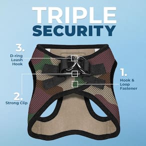 - Segurança tripla: nosso arnês oferece três camadas de proteção com um fecho de fecho aderente seguro, uma fivela resistente e anéis D duplos, garantindo a segurança do seu animal de estimação em todos os momentos