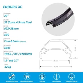 Modelo: Enduro Pro Furos: 32 (furo 4.5mm fino) Ilhós: Não Pneu Compatível: 1.90" até 2.70" Tipo de Pneu: Clincher ou Tubeless ETRTO: 622x28mm ERD: 600 Modalidade: Enduro / XC / Trail Válvula: Presta/Fina 6.5mm Medida Interna Aprox.: 28mm Medida Extrena Aprox.: 33mm Material: Alumínio 6061 Cor: Preto Peso Aprox.: 620g Marca: Flay