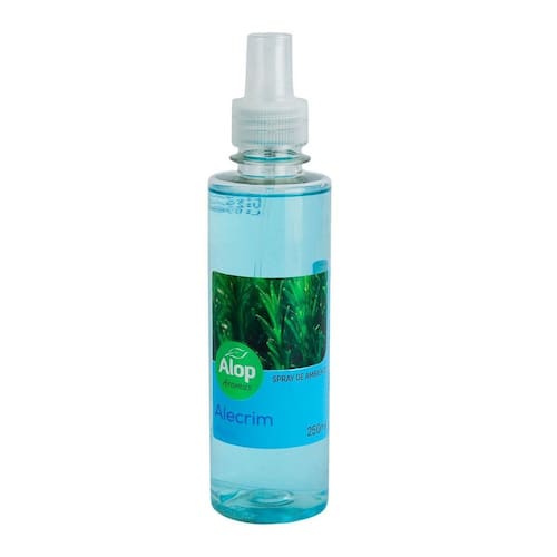 Aromatizador de Ambiente 250ml Spray Alecrim Aromatizador de ambiente 250ml Spray Alecrim. Contém fragrância de Spray Alecrim. Possui 250ml e acompanha 4 varetas de madeira reflorestada.\nMarca : ALOP Tipo de material : Água aromatizada Cores ou Estampa : Azul Dimensões do Produto : 20 X 5 X 5 CM Peso Bruto (Gramas) : 0.250 Marca: Não Informado