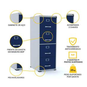 Sabe aquela mistura de atemporal com vintage? Pois é essa a personalidade deste arquivo de 4 gavetas, que vem em diversas opções de cores, como este clássico duo de azul escuro e cinza. Este arquivo para pastas suspensas é confeccionado em aço e tem a frente em madeira, sendo perfeito para organizar documentos em ambientes de trabalho, estudo e pesquisa que precisam de praticidade e estilo. Espaçoso por dentro e suave no deslize, este arquivo é um móvel essencial na organização e produtividade de escritórios, consultórios, empresas e até mesmo uma opção moderna e descolada para decorar seu home office. Esse item faz parte da Linha Maxxi de móveis para escritório da Pandin, a linha ideal para quem procura por ambientes de trabalho funcionais com alto valor agregado e formatos que permitem diversas formas de ambientação. Aposte certeiro na Linha Maxxi Pandin quando o assunto for praticidade, qualidade e versatilidade.