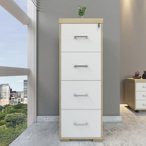 Feito com tampo em Tamburato 50mm, com fita de borda PVC. Sua estrutura em MDP e suas gavetas contem suporte para pasta suspensa e trilho telescópico. Acompanha também chave para travamento das gavetas.