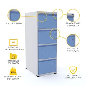 - Arquivo reforçado e muito resistente, comporta 40 a 50 pastas ou 45 kg por gaveta.