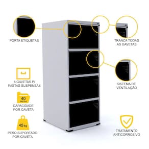 - Arquivo reforçado e muito resistente, comporta 40 a 50 pastas ou 45 kg por gaveta.