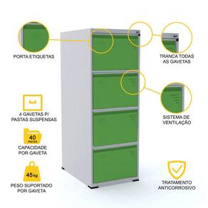- Arquivo reforçado e muito resistente, comporta 40 a 50 pastas ou 45 kg por gaveta.