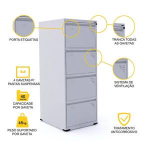 - Arquivo reforçado e muito resistente, comporta 40 a 50 pastas ou 45 kg por gaveta.