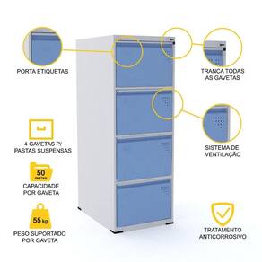 Ideal para organizar seu escritório com eficiência, este arquivo de aço conta com porta-etiqueta e puxadores estampados na parte superior das gavetas, além de acabamento em PVC. A fechadura cilíndrica tipo yale proporciona travamento simultâneo das gavetas, enquanto o sistema de deslizamento por patins de nylon assegura praticidade no uso diário. Confeccionado em chapas de aço de diferentes espessuras, o móvel recebe tratamento anti-corrosivo à base de fosfato de zinco e pintura eletrostática a pó, garantindo durabilidade e resistência. Suporta de 30 a 40 pastas ou até 25 kg por gaveta.