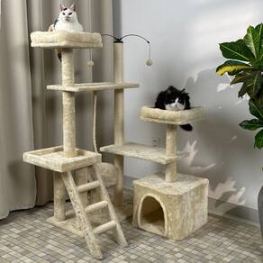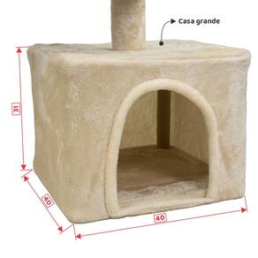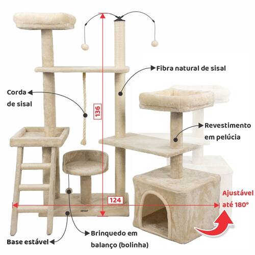 Desenhado por pessoas apaixonadas por gatos, esse luxuoso arranhador é composto por: Casa grande, três camas espaçosas, três poleiros, base, escada, brinquedo giratório, brinquedo em balanço e corda de sisal.