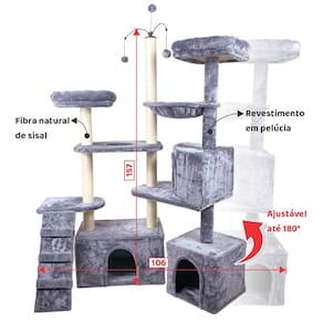 Possui colunas que são revestidas de fibra natural de sisal para seus felinos afiarem e lixarem suas unhas.