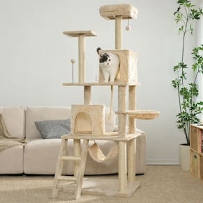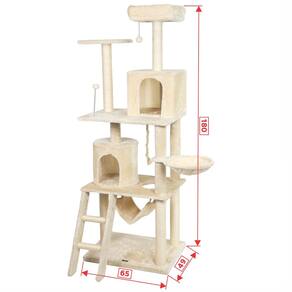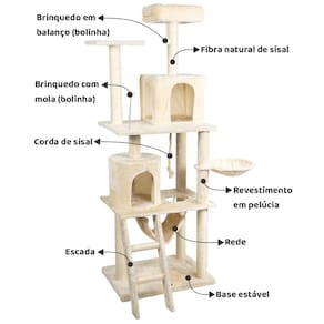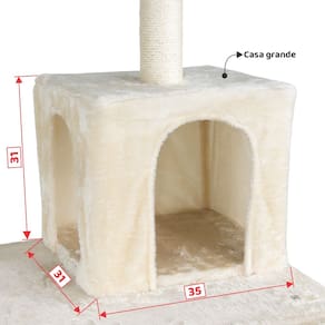 Desenhado por pessoas apaixonadas por gatos, esse luxuoso arranhador é composto por: Duas casas grandes, sendo uma quadrada e outra redonda, cama espaçosa com borda macia, cesto, poleiros, sendo um deles vazado para a passagem dos felinos, rede, base, escada, dois brinquedos em balanço no formato de bolinha e corda de sisal.