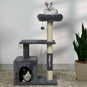 Desenhado por pessoas apaixonadas por gatos, esse luxuoso arranhador é composto por: Casa grande, cama espaçosa com bordas macias, poleiro, base estável e dois brinquedos em balanço, sendo um em formato de bolinha e o outro em formato de ratinho.