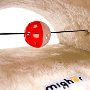 O arranhador também possui um brinquedo em balanço pendurado no poste em formato de bolinha e mais uma bolinha localizada na parte interna da base para o seu gatinho se divertir.