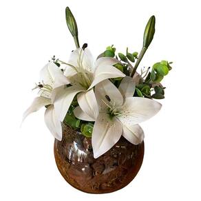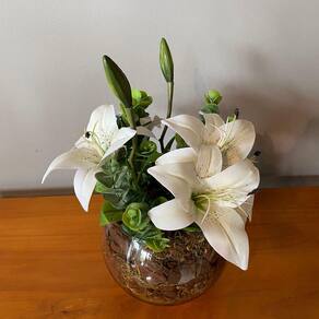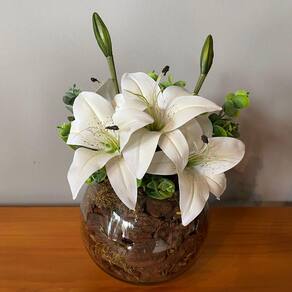 Arranjo permanente de Lírio em efeito hiper-realista com vaso transparente.