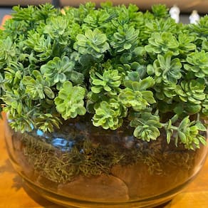 Arranjo permanente de verdinho em efeito hiper-realista com vaso incolor.